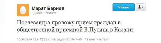 Экс-министр спорта Татарстана, а ныне исполнительный директор исполкома Олимпийского комитета России Марат Бариев проведет 18 апреля в Казани прием граждан. Как написал сам чиновник в своем Твиттере, принимать население Марат Бариев будет в приемной Владимира Путина.