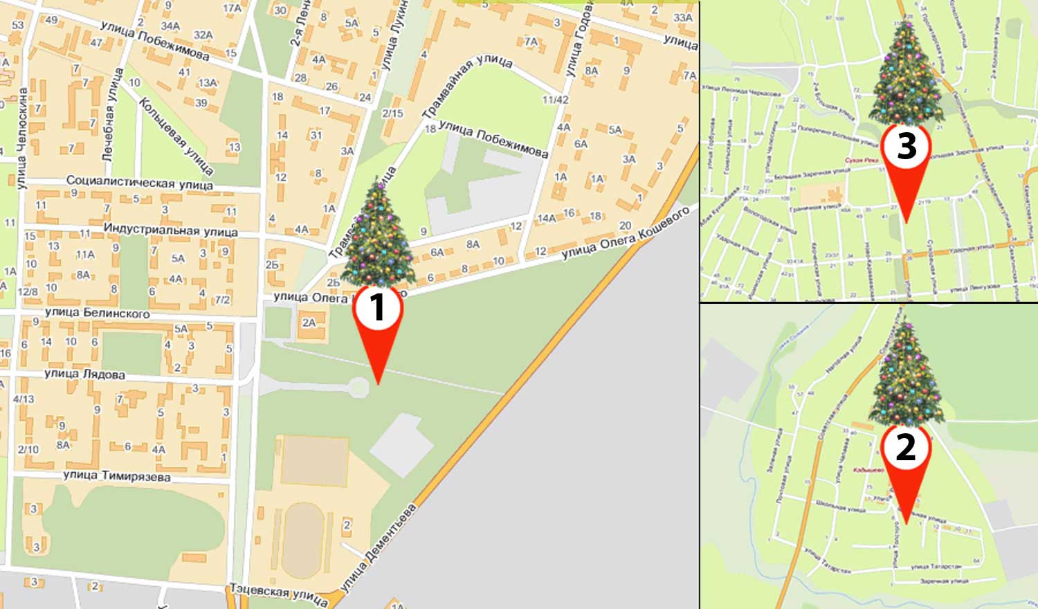 Всего в районе будет установлено 11 елок: «Центр» по ул.Космонавтов, 30, «М-6» по ул.Ак.Глушко, «Азино-1» по ул.Закиева, «Азино-2» по ул.Минская, 22, 23а, «Куба» по ул.Новаторов, 8, «Танкодром» по ул.Карбышева, 15, «2-я Азинская» по пр.Победы, 224, в поселке в Дербышки по ул.Мира (Комсомольская площадь), в жилых массивах Нагорный по ул.Дорожная, 35 и Большие Дербышки по ул.Кооперативная, 21а.
