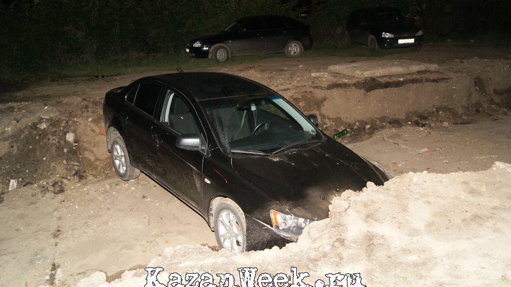 В ночь на понедельник, напротив 7-й городской больницы, Mitsubishi Lancer съехал в траншею. Яму раскопали, чтобы проложить теплотрассу. Иномарка ехала по Чуйкова со стороны улицы Адоратского. Машиной управляла девушка. По ее словам, при повороте во двор она перепутала педали. Из-за высокой скорости машина не смогла вписаться в поворот, смяла кусты и съехала в траншею. Автоледи не пострадала. Помятую машину девушка оставила на месте аварии до утра.