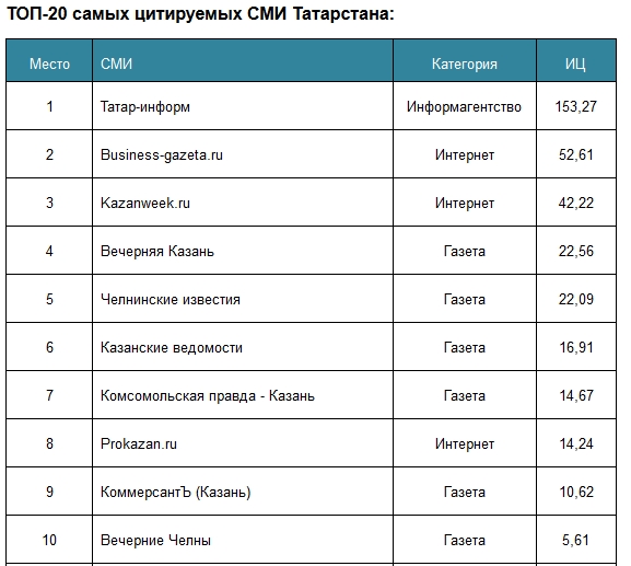 Лидеры медиа-рейтинга – информационное агентство Татар-информ, а также Интернет-ресурсы Business-gazeta.ru и Kazanweek.ru